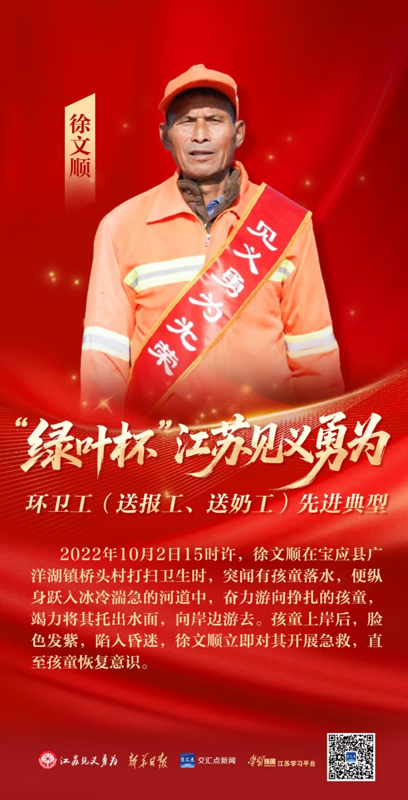 环卫工徐文顺荣获“绿叶杯”江苏见义勇为环卫工(送报工、送奶工...